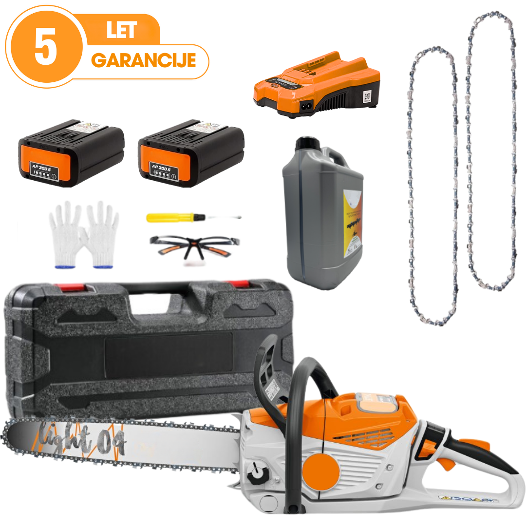 Darilo: 2 bateriji 40 V z zmogljivostjo 8.000 mAh, vključno s polnilcem, torbo za varno prenašanje, 2 rezervnima reziloma, rokavicami proti urezninam, izvijačem za vzdrževanje, zaščitnimi očali, 3L olja za verigo.