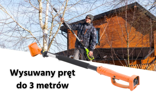 W zestawie: teleskopowy wysięgnik do 3 m, 2 akumulatory 5 000 mAh, kabel ładujący, kabura z paskiem i powerbank 10 000 mAh, klucze imbusowe i śrubokręt do regulacji, olej smarujący, 2 zapasowe ostrza, walizka transportowa.